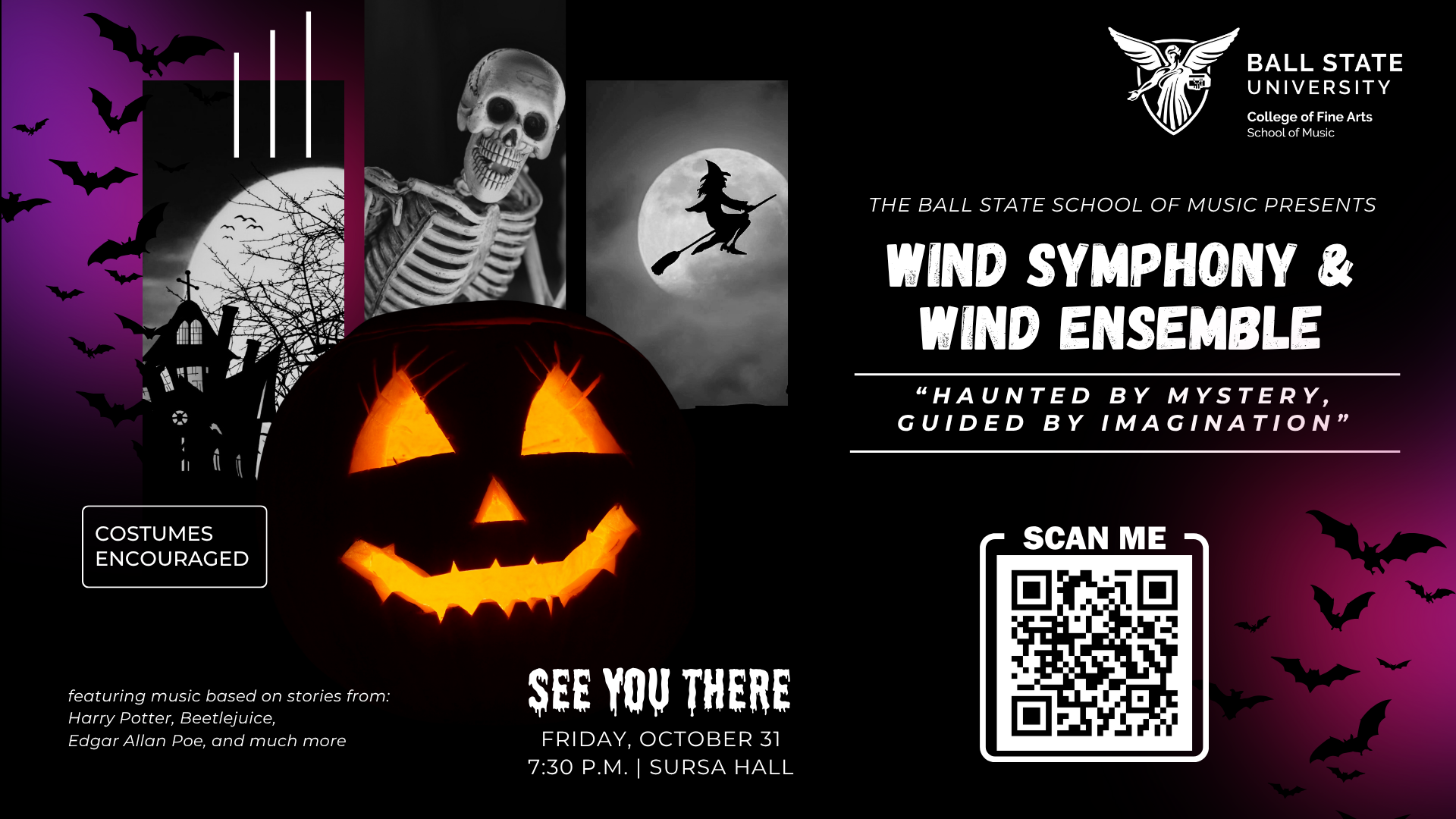 Ball State’s top two concert bands present a very special Halloween Spooktacular! Enjoy spooky vibes and feel free to wear your costume.